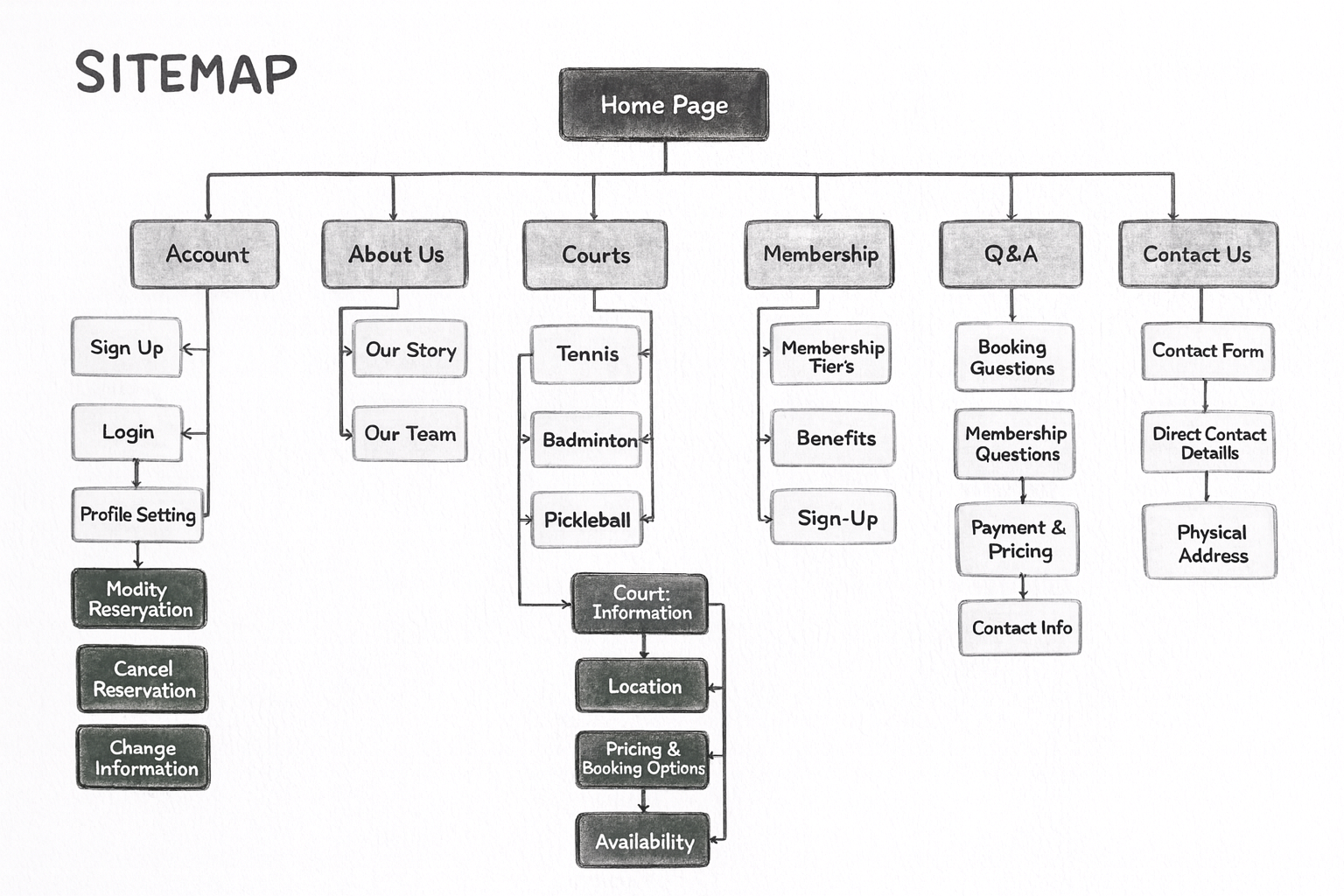 We created a sitemap to map out every key flow, from searching courts to booking and confirmation. This structure helped us identify redundant steps and clarify what users needed most.