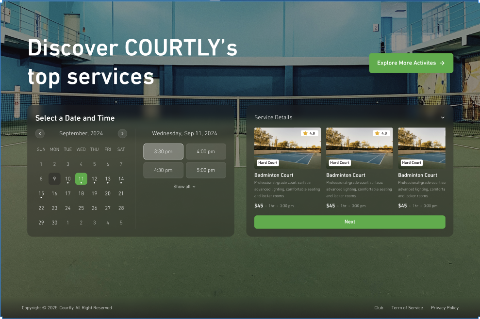 Courtly is a web app designed to simplify the process of booking tennis, badminton, and pickleball courts. The project focuses on clean UX flows, real-time calendar availability, and a user-friendly interface optimized for mobile and desktop use.